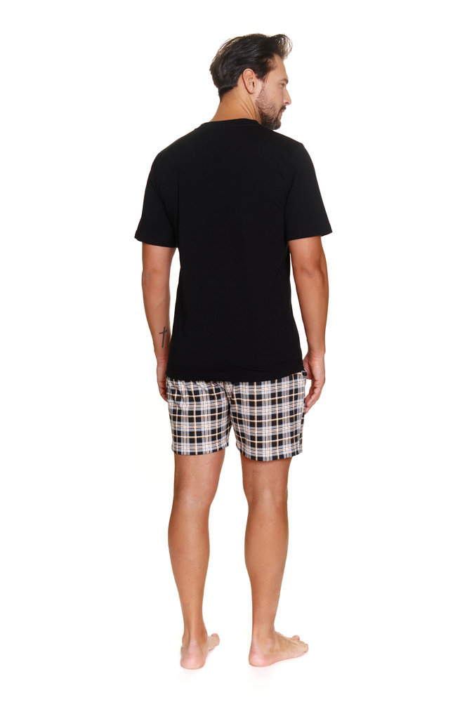 Piżama męska wykonana z wysokiej jakości miękkiej bawełny. Model o klasycznym kroju. Koszulka z krótkim rękawem, dekolt półokrągły. Spodnie krótkie, wzorzyste, wykończone komfortową gumką w pasie. Spodoba się najbardziej wymagającym mężczyzną.