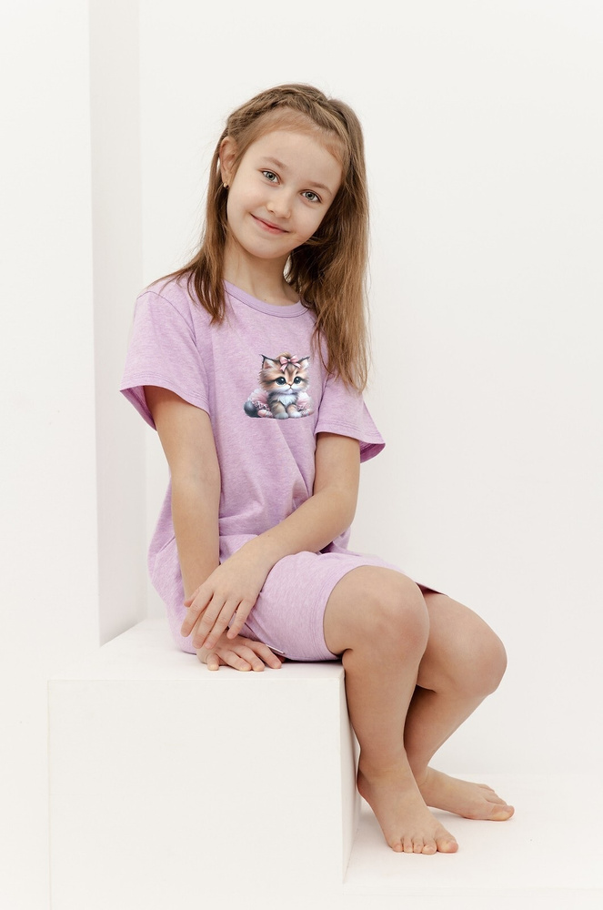 Koszula dziewczęca uszyta z wysokiej jakości bawełny. Dekolt okrągły, długość przed kolano, ozdobiona kolorowym nadrukiem .