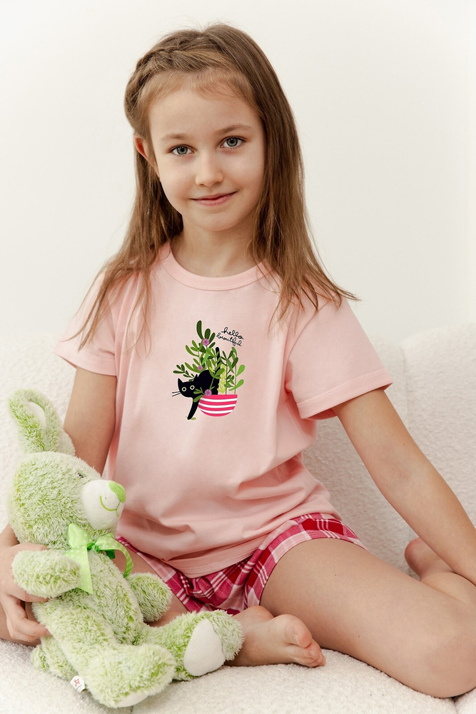 Piżama dziewczęca bawełniana. Koszulka z krótkim rękawem ozdobiona kolorowym nadrukiem. Do kompletu krótkie spodenki w kratkę