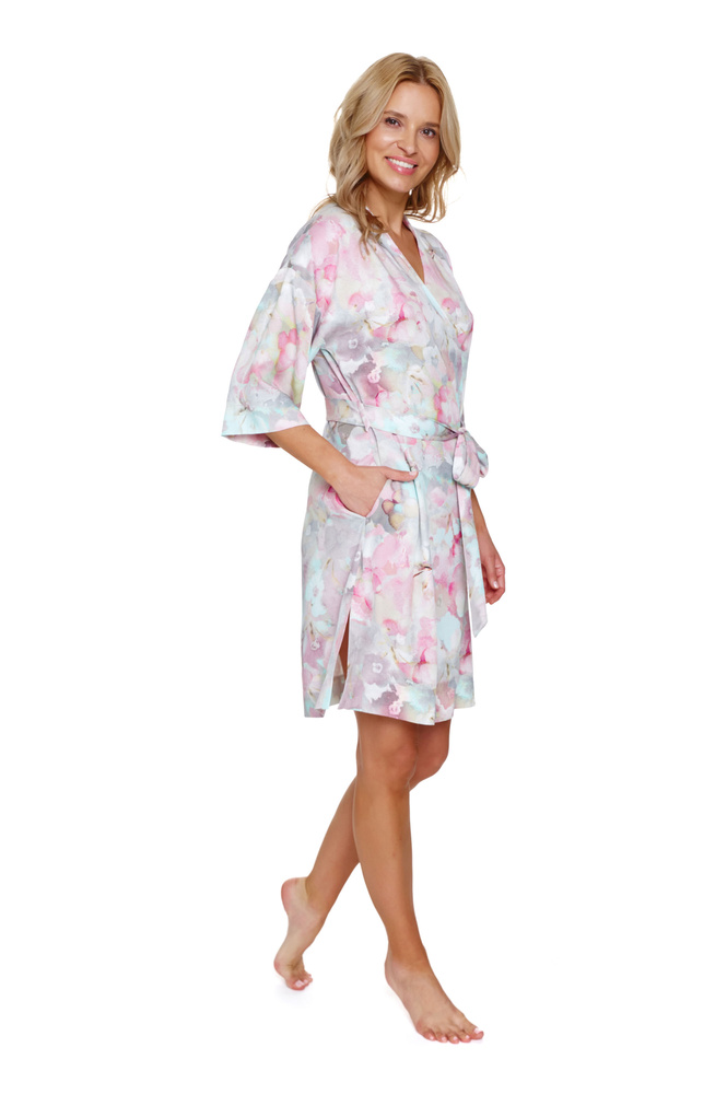 Romantyczny szlafrok damski. Kopertowy fason z paskiem świetnie dopasowuje się do sylwetki. Wykonany z delikatnej wiskozy. Szlafrok idealnie komponuje się z koszulą bądź piżamą dostępną w naszej kolekcji bielizny nocnej. W szlafroku możesz zachwycać i olśniewać swoją urodą, nawet jeśli tylko wybierasz się w nim do sypialni.