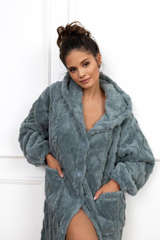 Szlafrok damski wykonany z miłej i miękkiej dzianiny typu soft. Model z długim rękawem i kapturem. Na wysokości bioder funkcjonalne kieszenie. Zapinany na guziki.