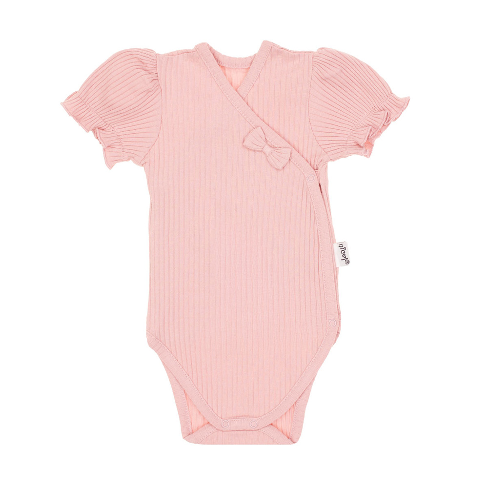 Body kopertowe z krótkim rękawem dla dziewczynki, uszyte z bawełny. Materiał posiada certyfikat Oeko-Tex Standard 100 Tekstylia godne zaufania. Model ten polecany jest dla noworodków, ponieważ zastosowane zapięcie kopertowe ułatwia ubieranie dziecka. Zapinane na bezniklowe napy z przodu oraz w kroku.