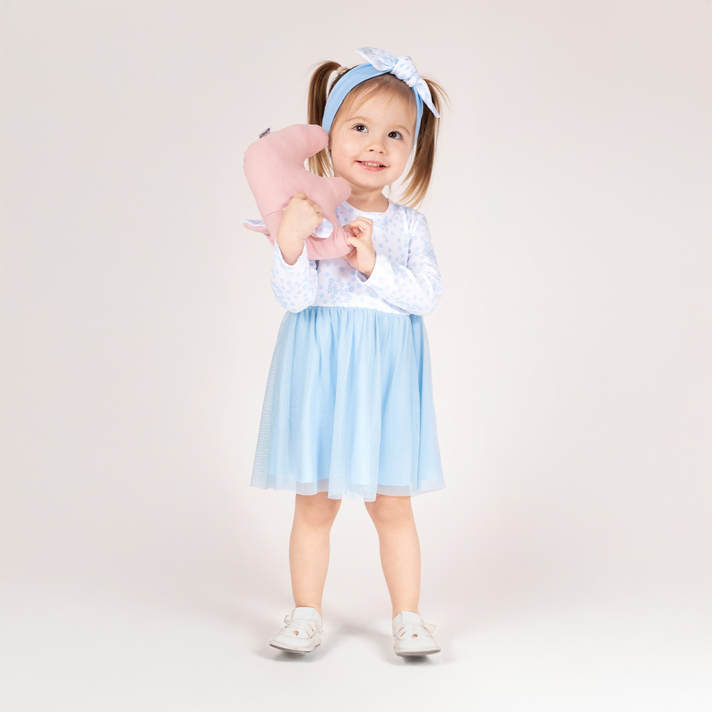 Modna sukienka wykonana z bawełny. Zapinana na bezniklowego napa na plecach. Dół spódnicy na zewnątrz został wykonany z niebieskiej siatki, która nadaje zwiewności. Materiał  jest całkowicie bezpieczny dla skóry dziecka.