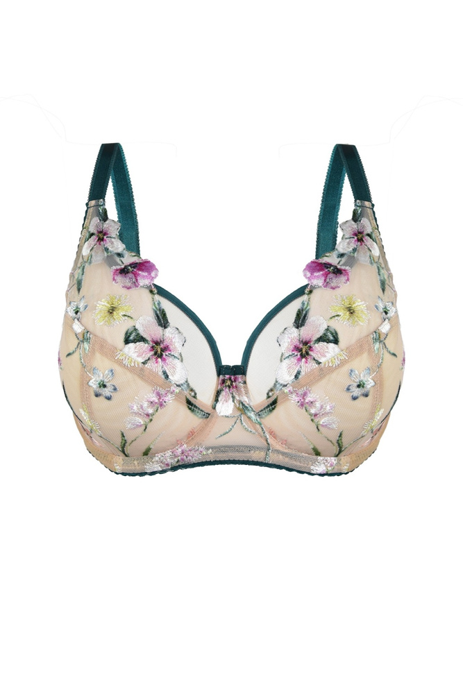 Biustonosz został zaprojektowany z myślą o średnich i dużych biustach Zapewnia maximum komfortu - głębsze miseczki z zabudowaną górą zapewnią umieszczenie biustu na miejscu przez cały dzień. Miseczki wykonane są z delikatnej, beżowej siatki, na którą nałożono, kwiecisty haft. Boki biustonosza wykonane są z grubej dzianiny, co zapewnia dodatkowe wsparcie i stabilność. Brak pionowych fiszbin podnosi komfort użytkowania. Biustonosz posiada regulowane ramiączka, które nie są odpinane. Dzięki możliwości regulacji, można je dostosować do indywidualnych potrzeb, zapewniając idealne dopasowanie i komfort noszenia. Miska łączy się z ramiączkiem łagodnie przechodząc w szmaragdową taśmę tworząc efekt braletki i dodając lekkości.
