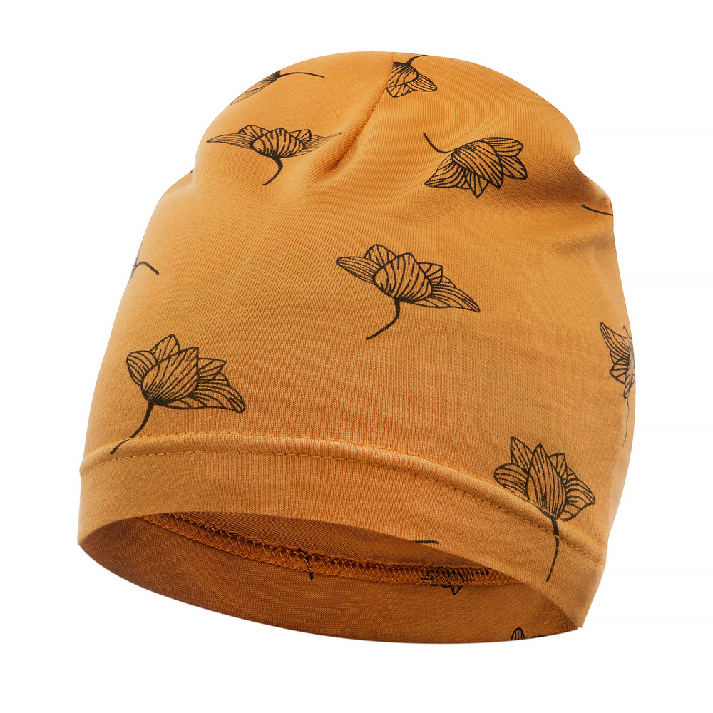 Czapka dziecięca typu beanie, z luźno opadającą górą, to model, który nigdy nie wychodzi z mody. Uszyta z miękkiej dzianiny w kolorze musztardowym, ozdobionej dziewczęcym nadrukiem orchidei. Dzięki dodatkowi elastanu doskonale dopasowuje się głowy dziecka, ale jej nie uciska. Podobnie jak wszystkie ubranka Pinokio, czapka wyprodukowana jest w Polsce. Warto o niej pamiętać kompletując jesienną i wiosenną garderobę dla Swojej córeczki.