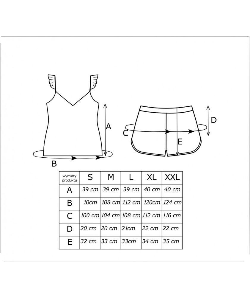 Piżama damska wykonana  z delikatnej bawełny. Koszulka na wąskim ramiączku zakończonym falbanką . Do kompletu luźne, wygodne szorty.