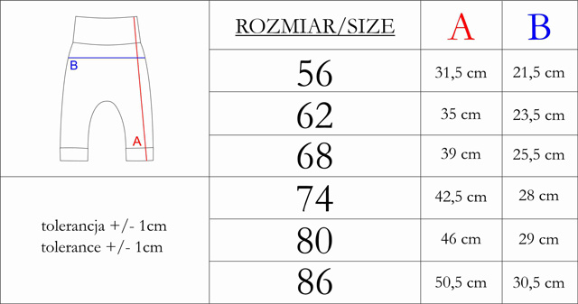 Zapytaj o produktSpodnie uszyte z gładkiej bawełny. Materiał jest całkowicie bezpieczny dla skóry dziecka. W pasie posiadają wygodną gumkę nieuciskającą brzuszka, która została przeszyta, aby zapobiec okręcaniu się.