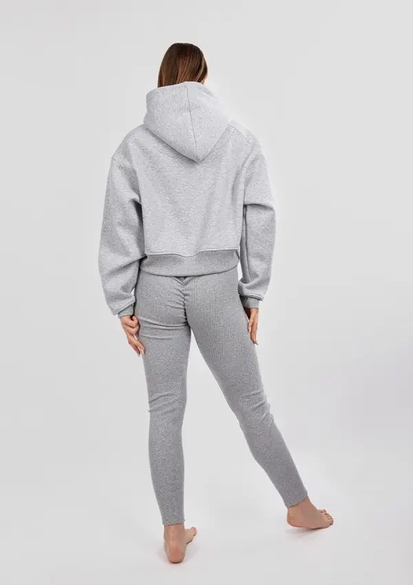 Komplet składa się z bawełnianych legginsów z marszczeniem na tylnej części oraz krótkiej, ciepłej bluzy, która doskonale komponuje się z całością. Zestaw jest idealny na codzienne aktywności, ale również na relaks w domowym zaciszu, gdy chcesz czuć się komfortowo i stylowo.