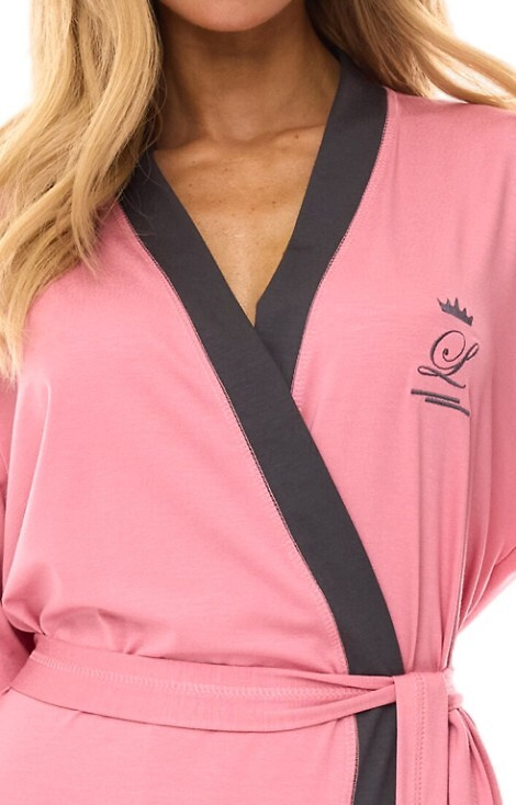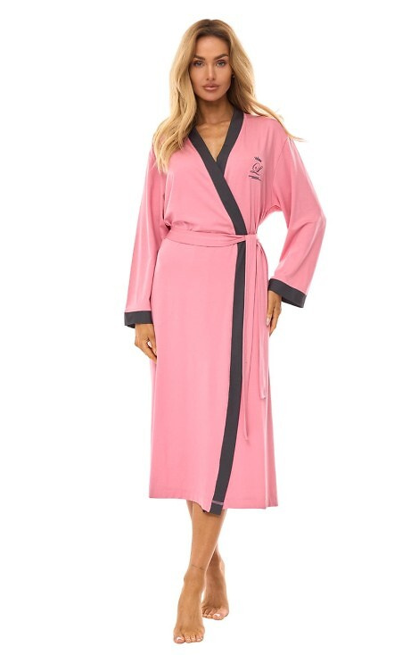 Szlafrok damski wykonany z miękkiej, przewiewnej wiskozy. Delikatnie otula ciało od góry i do połowy łydki. Wiązanie w pasie. Posiada dwie praktyczne kieszenie po bokach, dodające funkcjonalności. Ozdobna plisa w uzupełniającym kolorze, nadająca stylu.