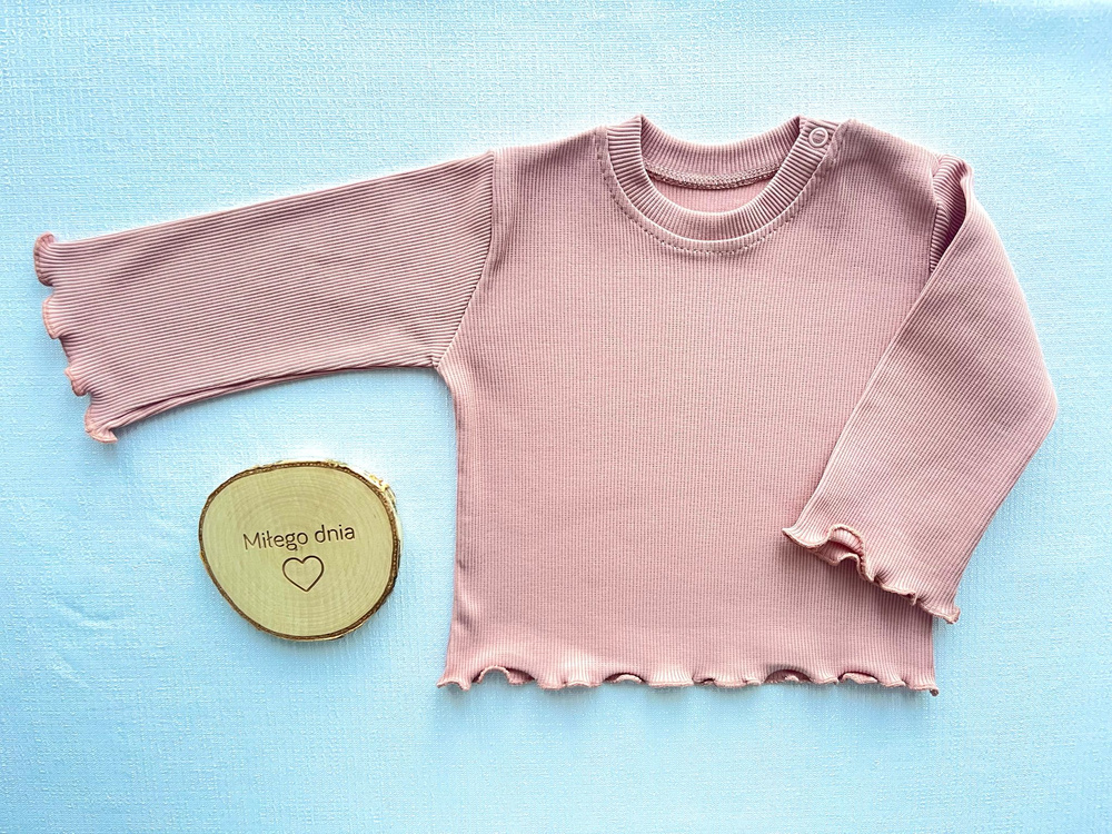 Bawełniana bluzka dziewczęca z długim rękawem. U dołu i przy rękawkach posiada uroczą falbankę.