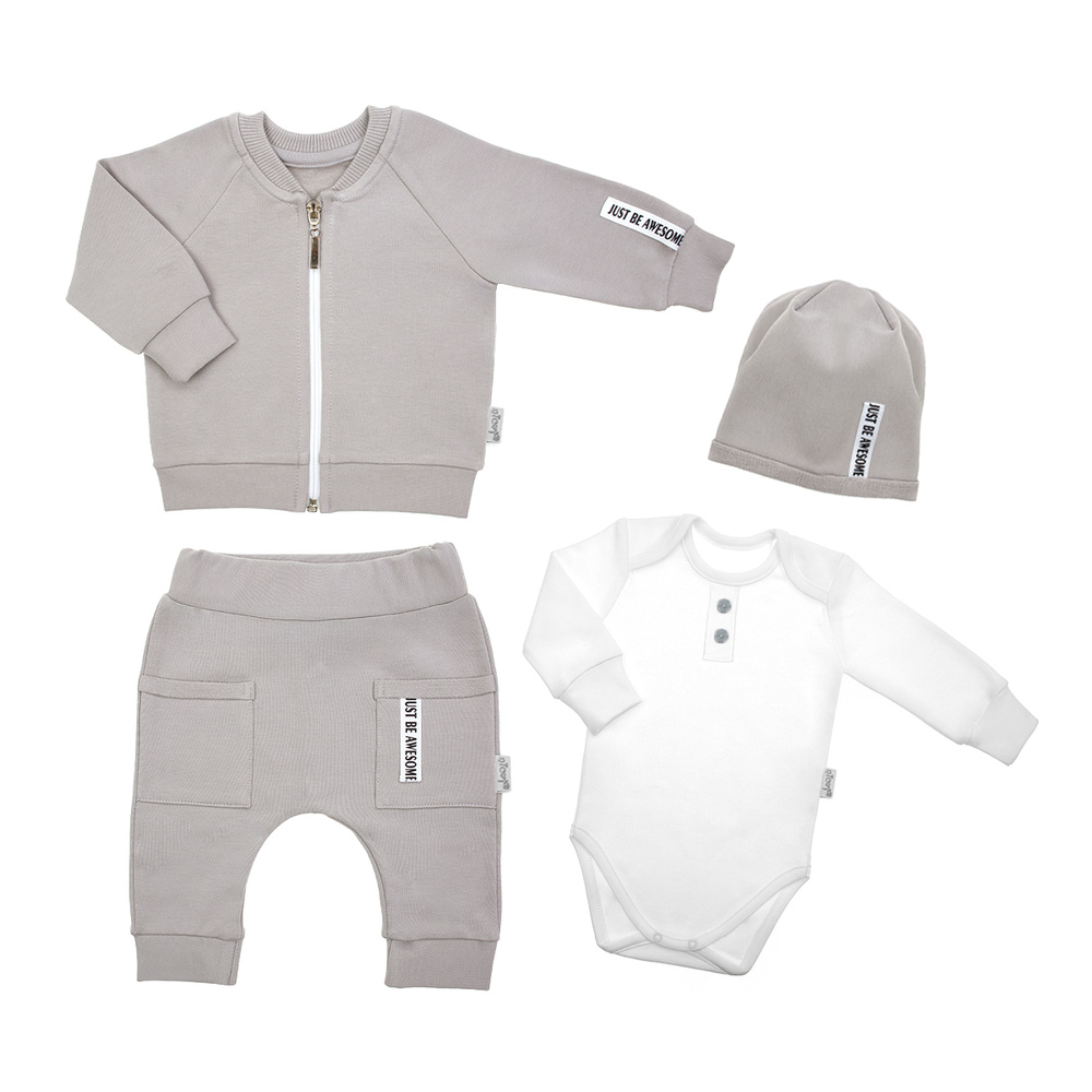 Zapytaj o produktKomplet składający się z 4 elementów: body na długi rękaw, czapki, spodni oraz bluzy na zamek typu bomberka. Komplet uszyty z bawełny dresowej z dodatkiem elastanu, posiada certyfikat Oeko-Tex Standard 100 Tekstylia godne zaufania.