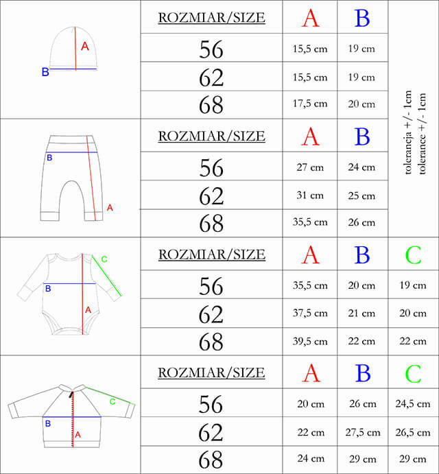 - Materiał: czapka,bluza,spodnie: 95% bawełna, 5%elastan, body: 100% bawełna