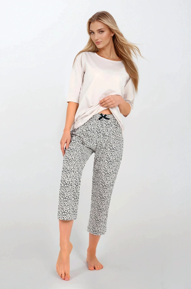 Elegancka i stylowa piżama damska. Bluzka z rękawem 3/4, spodnie 7/8 bez kieszeni. Dekolt półokrągły. Klasyczne szorty wykonane z delikatnej bawełny. Idealna również jako homewear. Wykonana z naturalnych materiałów. Zaprojektowana i uszyta w Polsce
