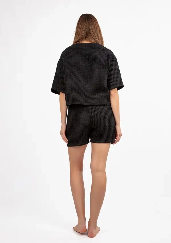 Komplet składający się z krótkich spodenek oraz skróconego T-shirtu, komplet został uszyty w Polsce z wysokogatunkowej 100% bawełny wafelkowej, która jest nie tylko przyjemna w dotyku, ale również przewiewna i trwała. Kremowy odcień tkaniny dodaje całości subtelności – pasując do wielu stylizacji i dodatków. Bawełna wafelkowa, to wyjątkowy materiał, który zyskał popularność dzięki swojej strukturze i właściwościom użytkowym. Dodatkowo tkanina nie prześwituje. Dzięki delikatnemu splotowi tkanina ta zapewnia świetną wentylację, co czyni ją idealną na lato.