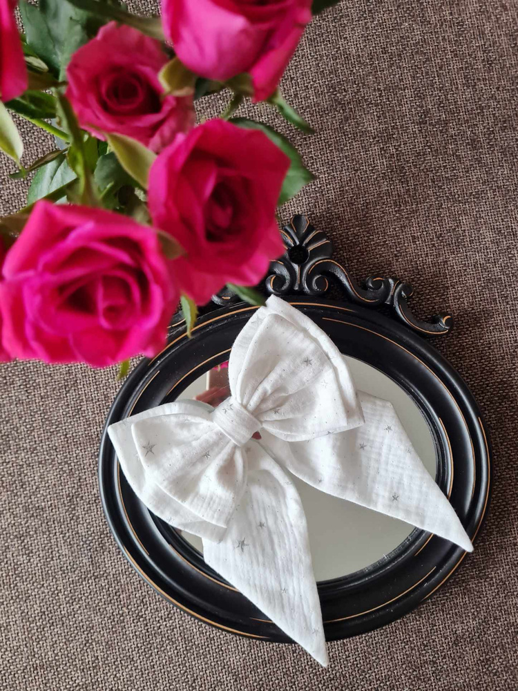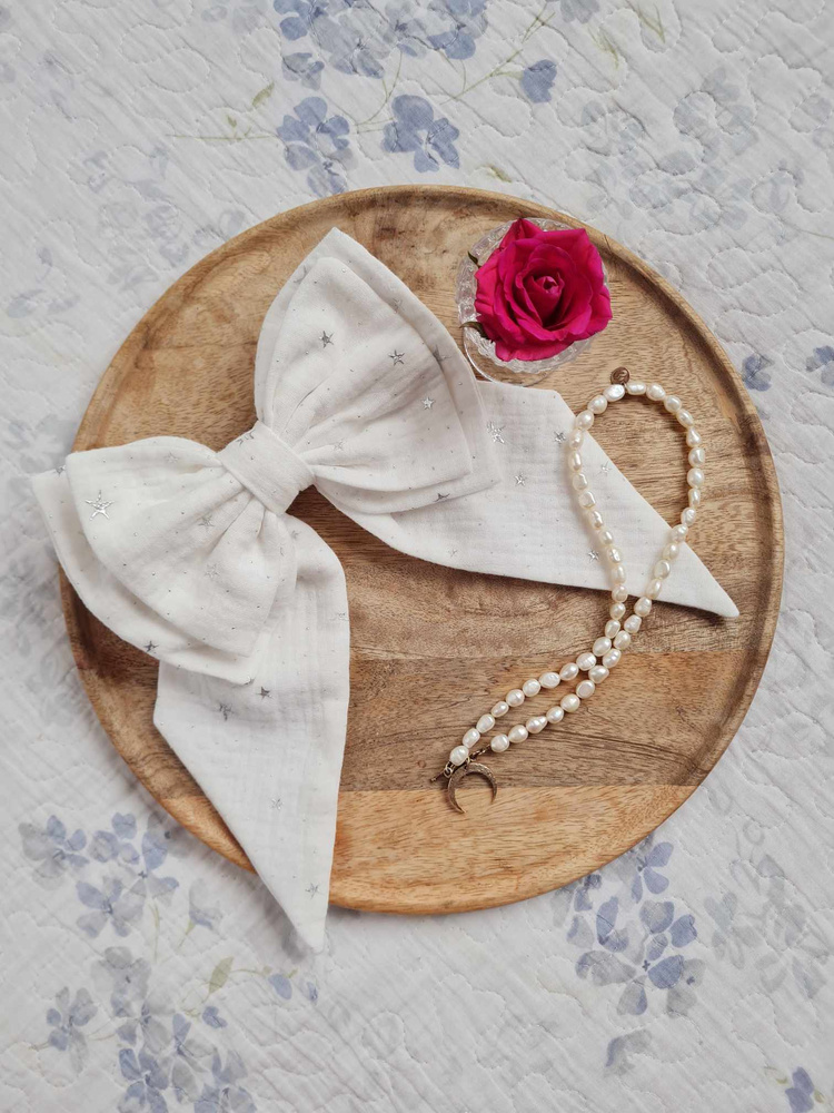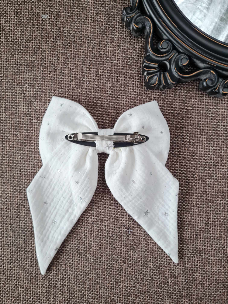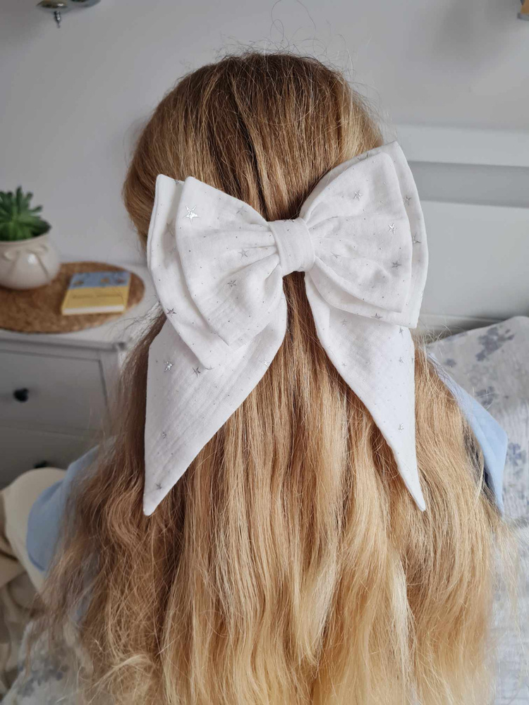 Duża spinka w postaci kokardy. Kokarda jest uszyta z muślinu z delikatnymi połyskującymi drobinkami. Kokarda jest przymocowana do automatycznej klamry do włosów, dzięki czemu łatwo można ją założyć i przymocować do włosów. Pasuje do każdej stylizacji, dla kobiet i dziewczynek.