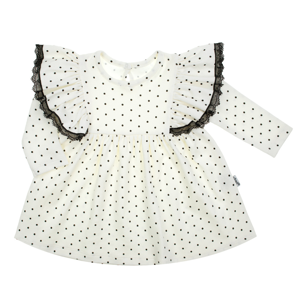 Piękna ponadczasowa sukienka na długi rękaw dla dziewczynki. Góra klasyczna przyozdobiona na ramionach tzw. Motylkami. Zapinana z tyłu. Doskonale sprawdzi się w szafie każdej dziewczynki.