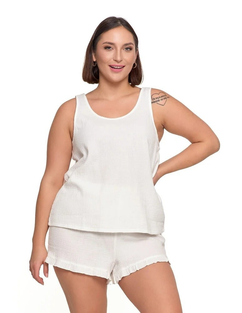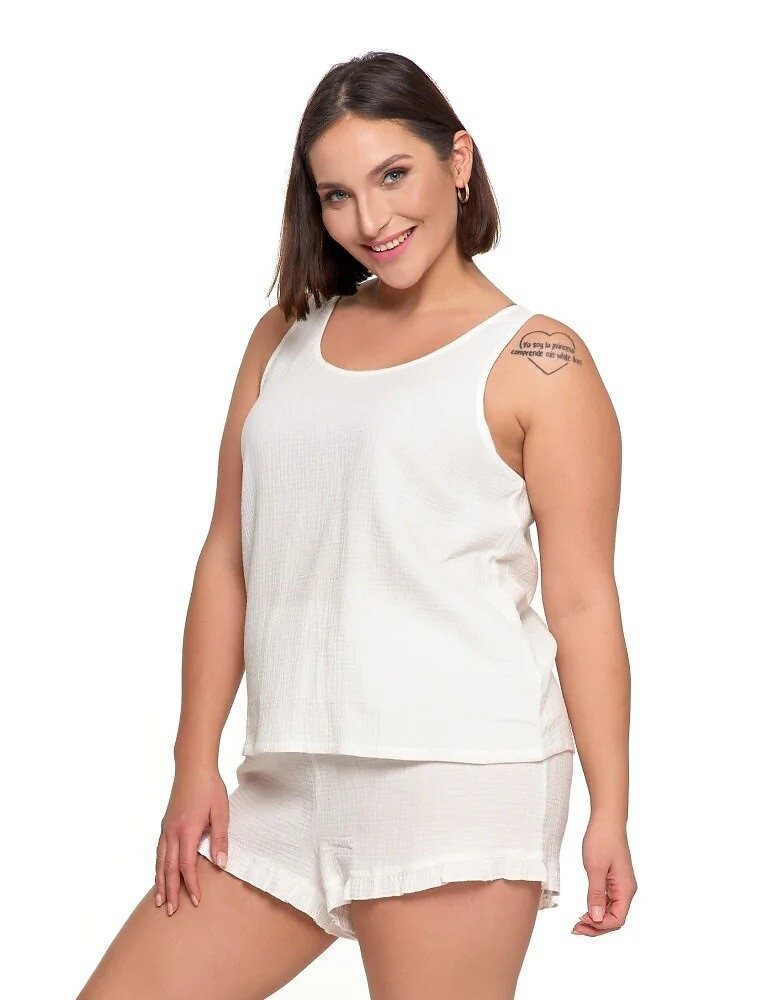 Piżama damska dwuczęściowa na szerokim ramiączku i krótkimi spodenkami to idealna propozycja dla kobiet, które cenią sobie wygodę i komfort podczas snu. Wykonana z lekkiej, przewiewnej muślinowej tkaniny, gwarantuje uczucie lekkości i swobody ruchów przez całą noc. Szorty o luźnym z elastyczną gumką w pasie, zakończone falbanką