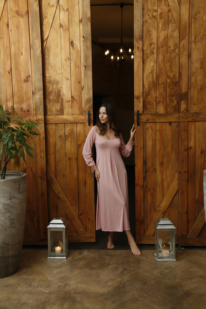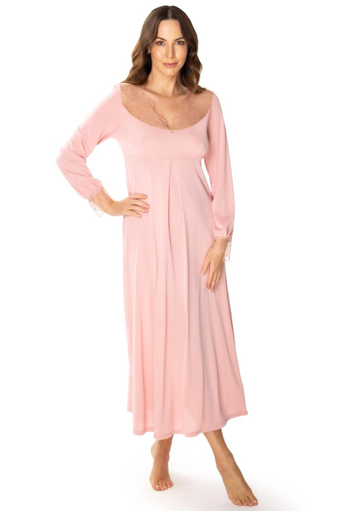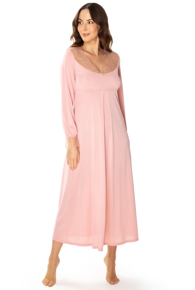 Koszula stworzona z myślą o kobietach ceniących elegancję, wygodę i klasyczne fasony. Wykonana z delikatnej, oddychającej dzianiny VISTEX®. Doskonale otula ciało, zapewniając komfort noszenia przez całą noc. Model odcinany pod biustem subtelnie podkreśla sylwetkę i maskuje ewentualne niedoskonałości, a długość maxi oraz długi rękaw czynią ją idealnym wyborem na chłodniejsze dni. Zmysłowe koronkowe detale na dekolcie i rękawach dodają romantycznego charakteru