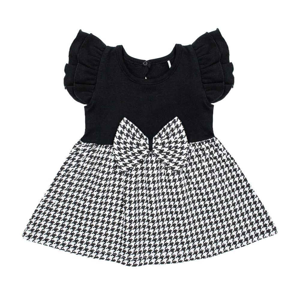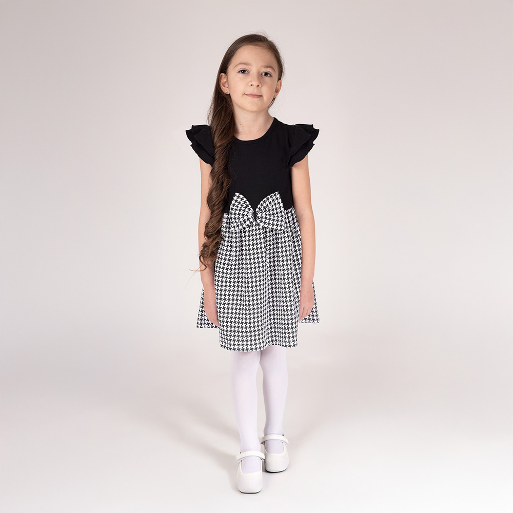Piękna ponadczasowa sukienka z krótkim rękawem dla dziewczynki. Góra klasyczna czerń przyozdobiona na ramionach tzw. Motylkami. Dół to klasyczny wzór pepitka w tali przyozdobiony kokardą. Na plecach zapięcie typu łezka, na bezniklowego napa. Doskonale sprawdzi się w szafie każdej dziewczynki.