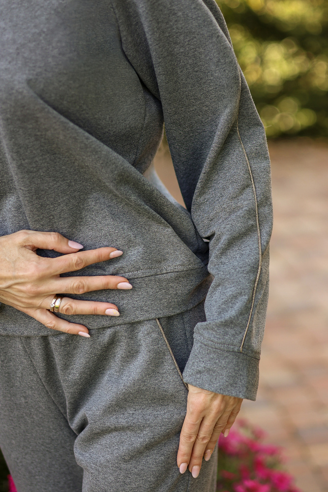 Komplet składa się z bluzy o klasycznym kroju oraz spodni z wygodnym pasem i kieszeniami. Efektowne zdobienia w postaci delikatnego, błyszczącego przeszycia na rękawach i przy kieszeniach nadają dresowi niepowtarzalnego charakteru.