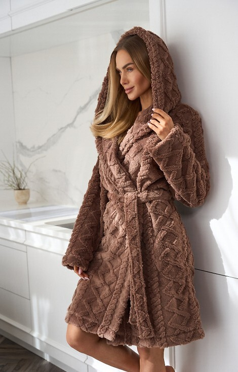 Krótki szlafrok damski L&L 2401 Geo to idealny wybór dla kobiet ceniących wygodę i elegancję w domowym zaciszu. Szlafrok wykonany jest z miękkiej dzianiny z efektownym wytłaczanym wzorem, która przyjemnie otula ciało i zapewnia komfort noszenia. Długi rękaw i praktyczny kaptur chronią przed chłodem, a wiązanie w pasie pozwala idealnie dopasować szlafrok do sylwetki. Dwie zewnętrzne kieszenie na wysokości bioder dodają funkcjonalności – pomieszczą drobiazgi lub ogrzeją dłonie.