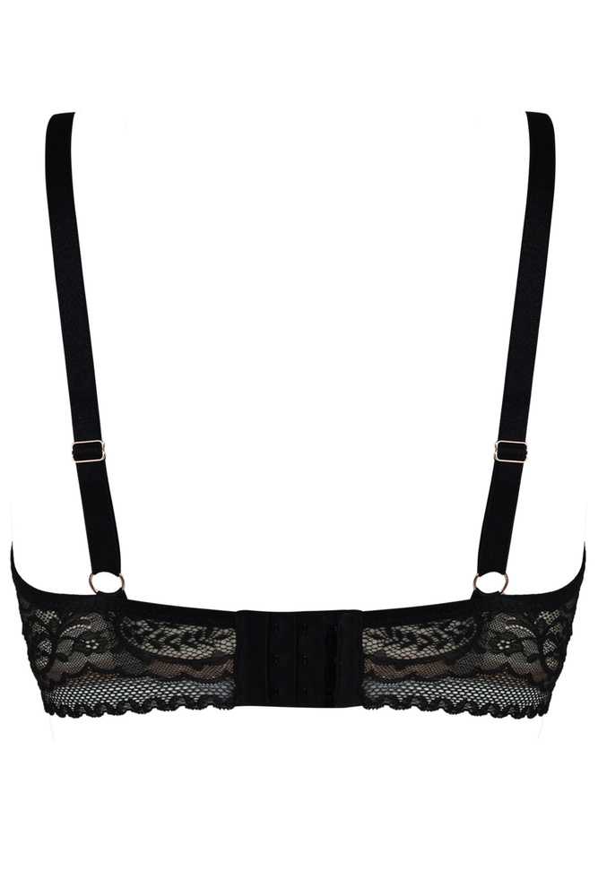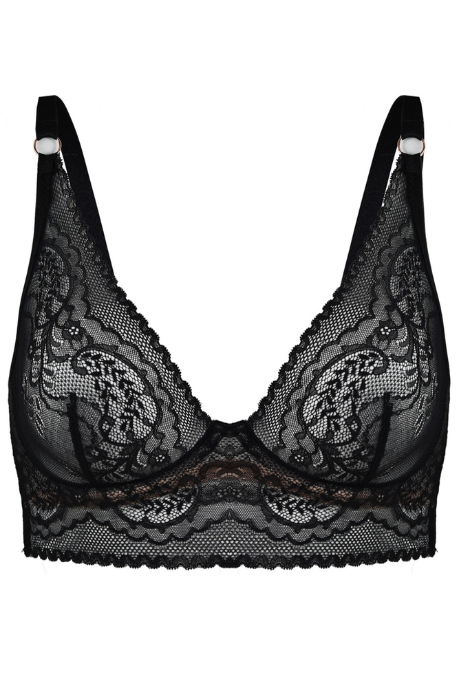 - Braletka Mediolano Feel Long 19236 z czarnej koronki, z przedłużonym pasem pod biustem. Wygodna i kobieca, idealna na mniejszy i średni biust.