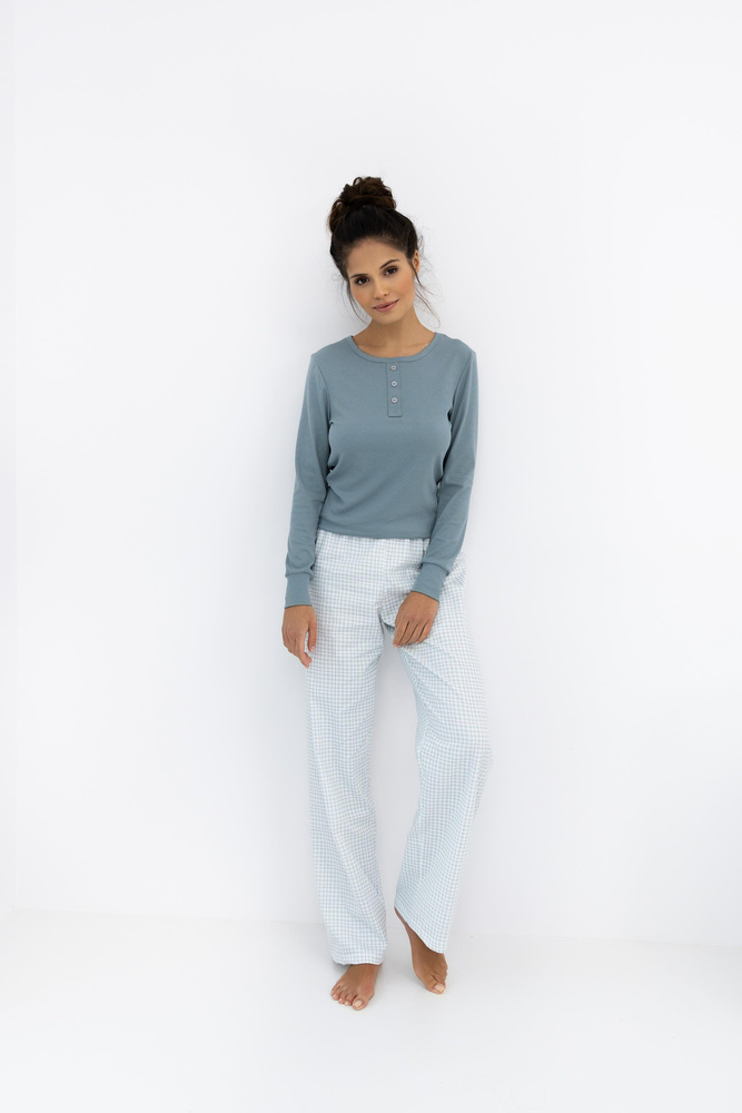 Piżama damska Janelle to idealne połączenie stylu i wygody. Górę stanowi koszulka z długim rękawem, wykonana z miękkiej, prążkowanej dzianiny z domieszką modalu, bawełny i elastanu. Okrągły dekolt z ozdobnymi guzikami dodaje jej subtelnego uroku. Do kompletu dołączone są długie, proste spodnie w modną kratę, uszyte z przewiewnej mieszanki bawełny i wiskozy. Elastyczna guma w pasie zapewnia wygodę noszenia przez całą noc. Idealna na chłodniejsze wieczory, świetnie sprawdzi się także jako prezent.