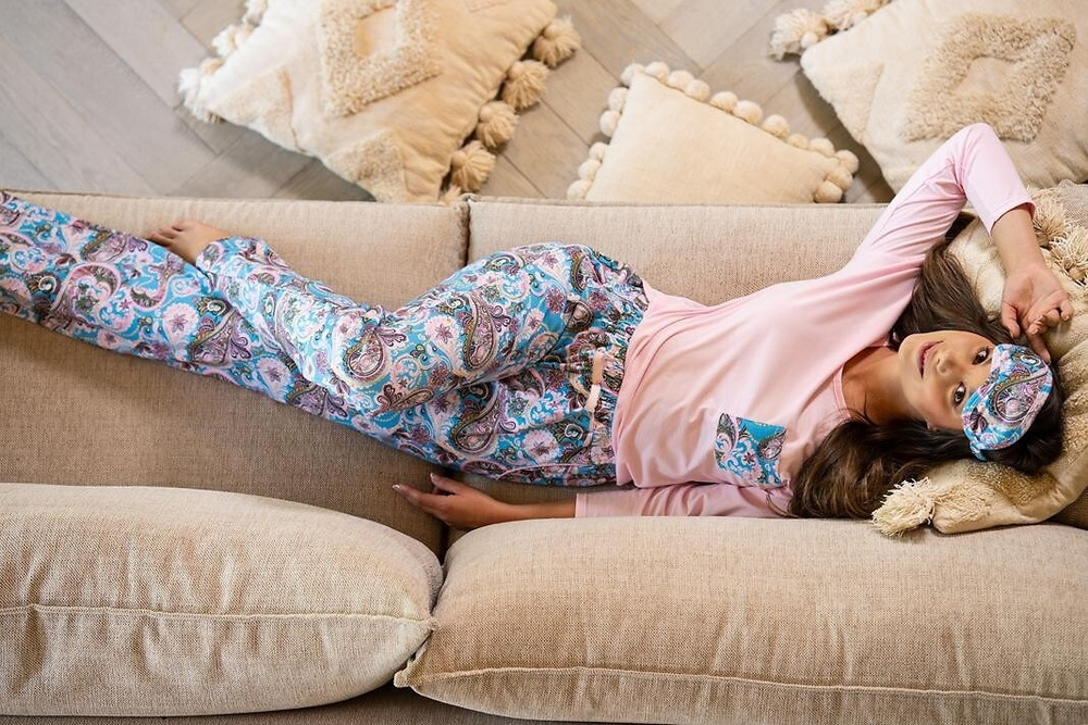 Bluzka z długim rękawem ma kobiecy, delikatny krój, który subtelnie podkreśla sylwetkę, jednocześnie zapewniając pełną swobodę ruchów. Spodnie w pasującym wzorze lub stonowanym kolorze tworzą spójną, elegancką całość.