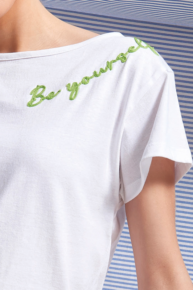 Koszulka z krótkim rękawem ma klasyczny okrągły dekolt i ozdobny haft, który dodaje jej subtelnego uroku. Szorty w kratkę posiadają kontrastową lamówkę, elastyczną talię oraz sznurek, który pozwala dopasować obwód do sylwetki.