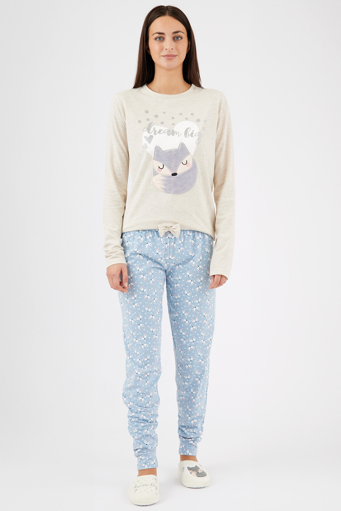 Spodnie są długie i proste, zakończone ściągaczami przy nogawkach, które zapewniają wygodne dopasowanie. Szeroka gumka w pasie i ozdobna kokardka sprawiają, że piżama jest nie tylko funkcjonalna, ale i estetyczna.