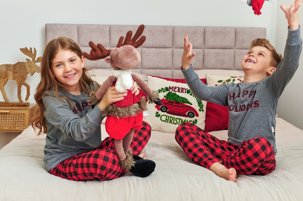 Szara góra z nadrukiem „Happy Holidays” wprowadza świąteczny nastrój, a spodnie w czerwono-czarną kratę dodają stylu i radości. Luźny krój nie krępuje ruchów, dzięki czemu piżama sprawdzi się także podczas zabawy w domu.