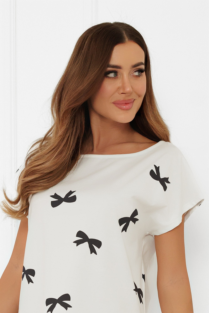 Model w kolorze ecru został ozdobiony delikatnym wzorem czarnych kokardek, który nadaje całości stylowego charakteru. Luźny fason zapewnia swobodę ruchów, a krótkie rękawy sprawiają, że koszula doskonale sprawdzi się przez cały rok.