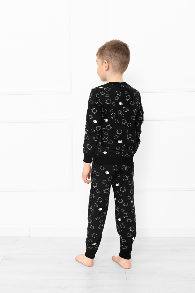• Piżama dziecięca Wito z wyjątkowo miękkiej dzianiny MEGA SOFT (100% bawełna). Luźny krój, bluzka z długim rękawem i ściągaczami, spodnie ze ściągaczami w nogawkach. Uroczy wzór owieczek na czarnym tle – idealna na każdą porę roku.