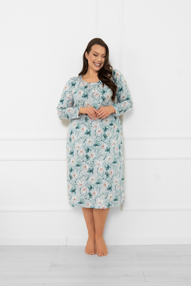 Model ma luźny fason i długie rękawy, co czyni go idealnym wyborem na chłodniejsze noce. Okrągły dekolt zdobi delikatne marszczenie oraz atłasowy lampas z kokardką, nadając koszuli romantycznego, kobiecego charakteru. Całość utrzymana jest w pastelowej tonacji z subtelnym, kwiatowym nadrukiem, który podkreśla lekkość i elegancję.