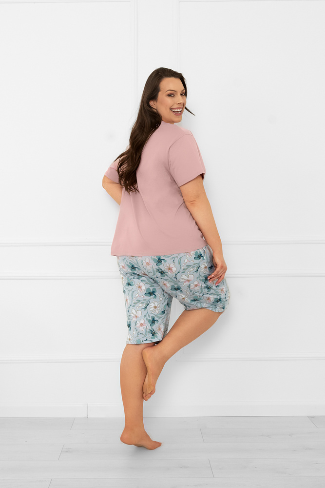 Piżama damska Perlis to połączenie wygody i delikatnego, kobiecego stylu. Zestaw składa się z gładkiej koszulki z krótkim rękawem i okrągłym dekoltem oraz spodni o długości 1/2 z elastyczną talią. Spodnie zdobi subtelny kwiatowy wzór w pastelowych kolorach, który dodaje uroku. Wykonana z naturalnej bawełny, piżama jest przewiewna i przyjemna w dotyku – idealna na lato. Sprawdzi się zarówno do snu, jak i do relaksu w domowym zaciszu.