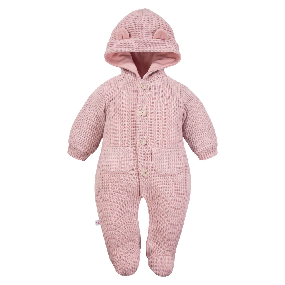 - Pajac sweterkowy Eevi w kolorze różowym. Z kapturem ozdobionym uszkami, zapinany na guziki. Wykonany z miękkiej dzianiny, idealny na chłodniejsze dni.