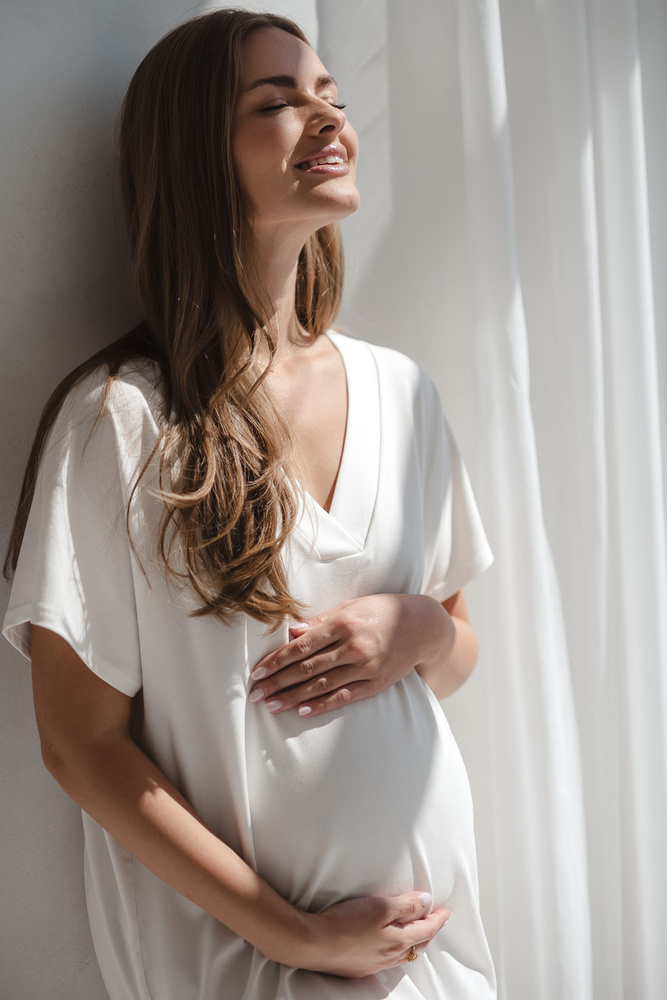 Koszula nocna Moon to model stworzony specjalnie dla kobiet w ciąży oraz mam karmiących, które szukają komfortu, funkcjonalności i elegancji w jednym. Uszyta z najwyższej jakości wiskozy, jest niezwykle miękka, jedwabiście gładka i przyjemna w dotyku. Dzianina posiada certyfikat Oeko-Tex Standard 100, co oznacza bezpieczeństwo nawet dla najbardziej wrażliwej skóry.