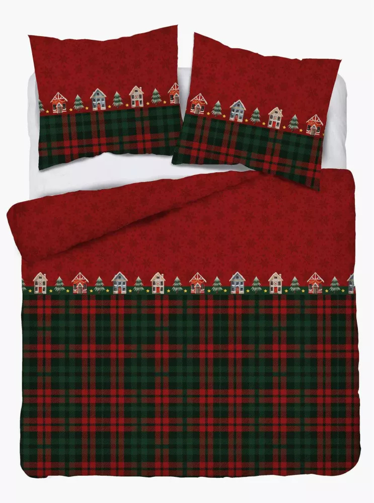 5619 B Magia Świąt Pościel flanelowa świąteczna Detexpol czerwona w domki i kratę– bawełna 100%, 160 g/m², zamek, OEKO-TEX®