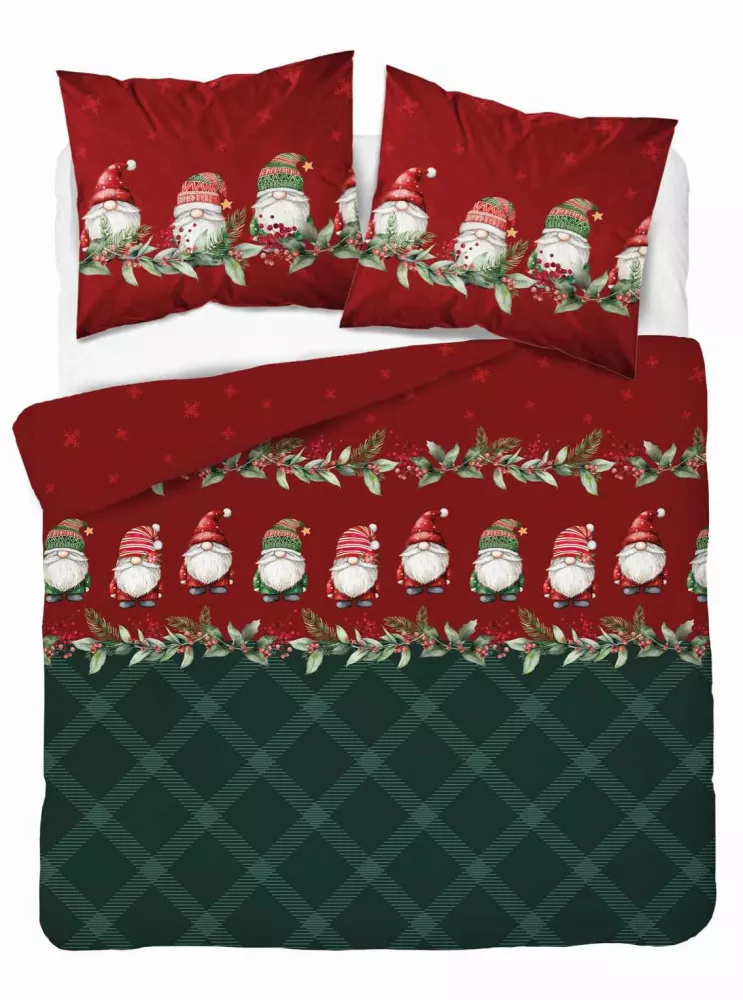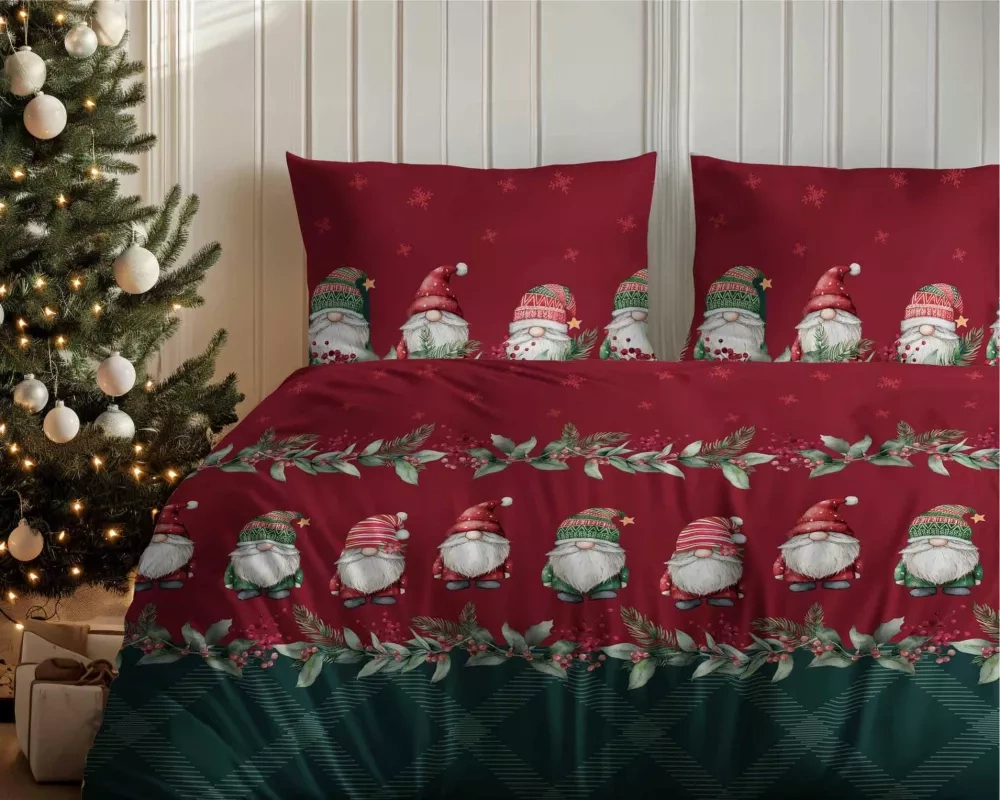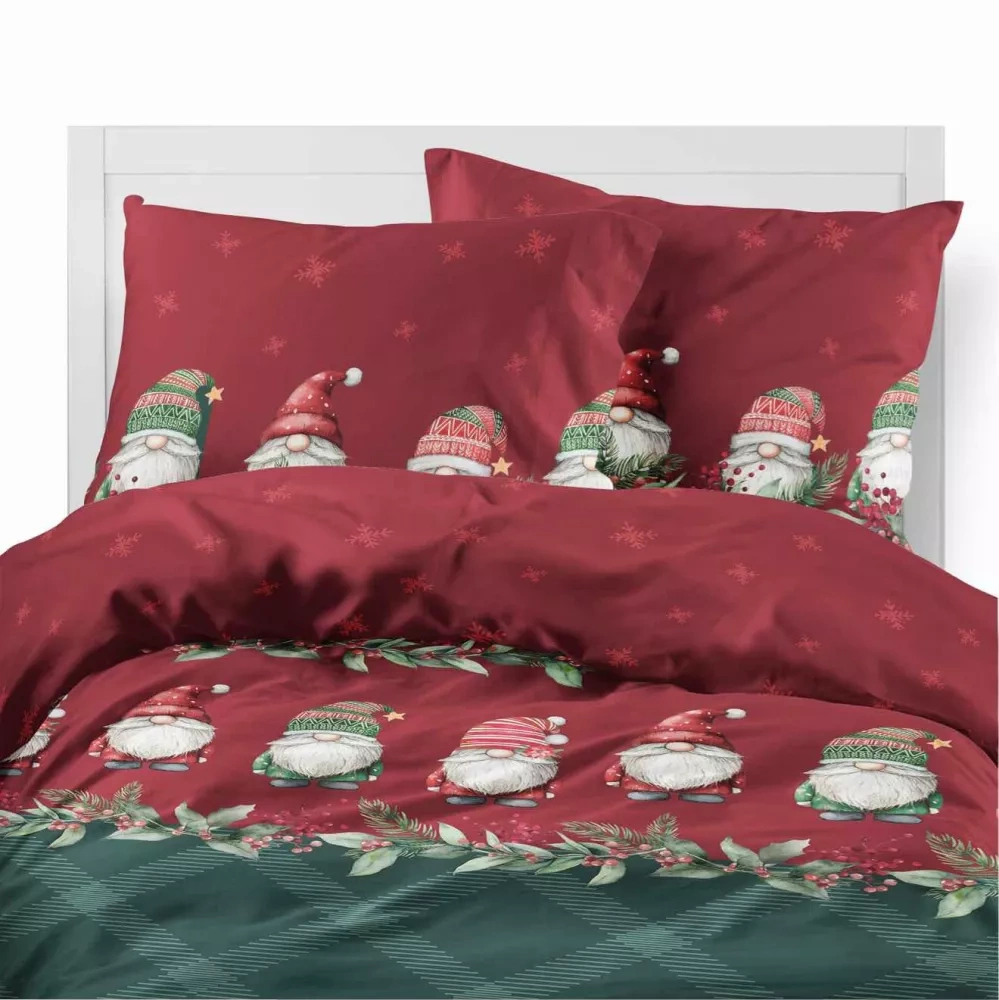 5618 B Magia Świąt Pościel flanelowa świąteczna Detexpol w skrzaty na bordowo-zielonym tle– bawełna 100%, 160 g/m², zamek, OEKO-TEX®