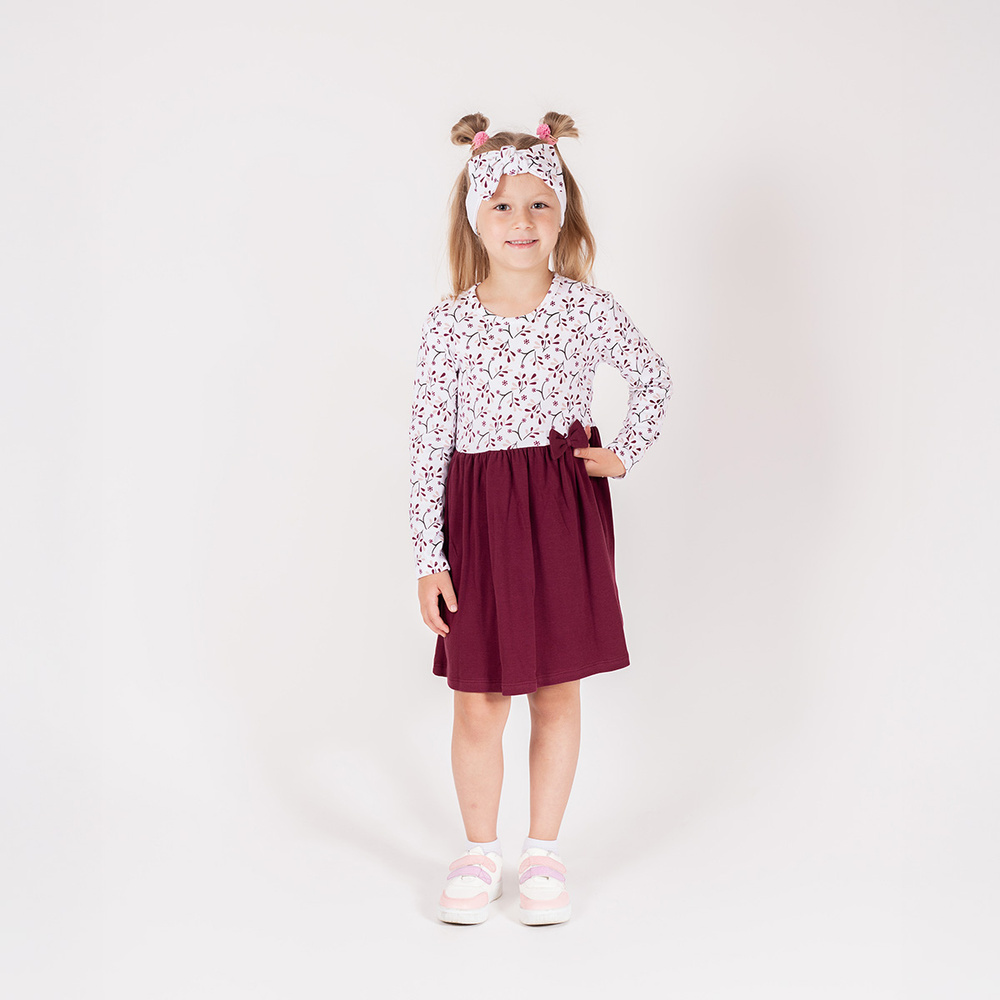 Zapytaj o produktSukienka Nicol Alisa 217166 to połączenie elegancji i wygody. Górna część ozdobiona jest subtelnym, roślinnym wzorem, a jednolity, bordowy dół nadaje całości klasycznego charakteru. Uroku dodaje kokardka w pasie, która podkreśla dziewczęcy styl.