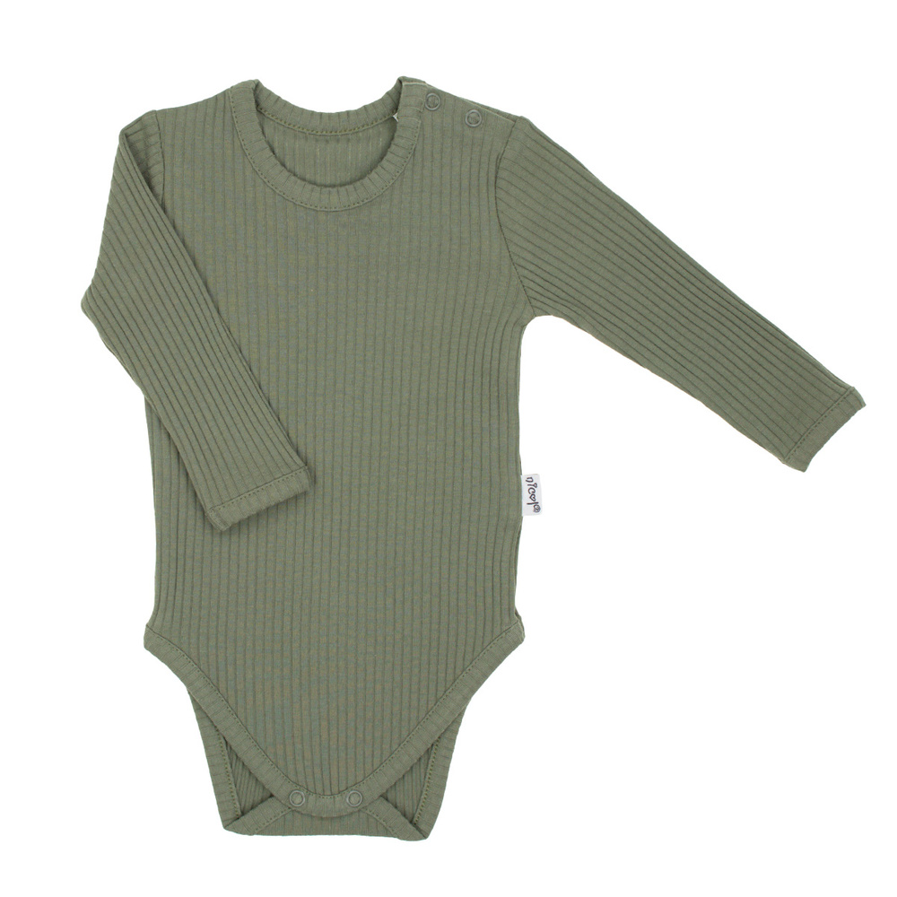 Zapięcia na napy na ramieniu i w kroku ułatwiają ubieranie oraz przewijanie maluszka. Długi rękaw sprawia, że body świetnie nadaje się na chłodniejsze dni, a modny kolor khaki.