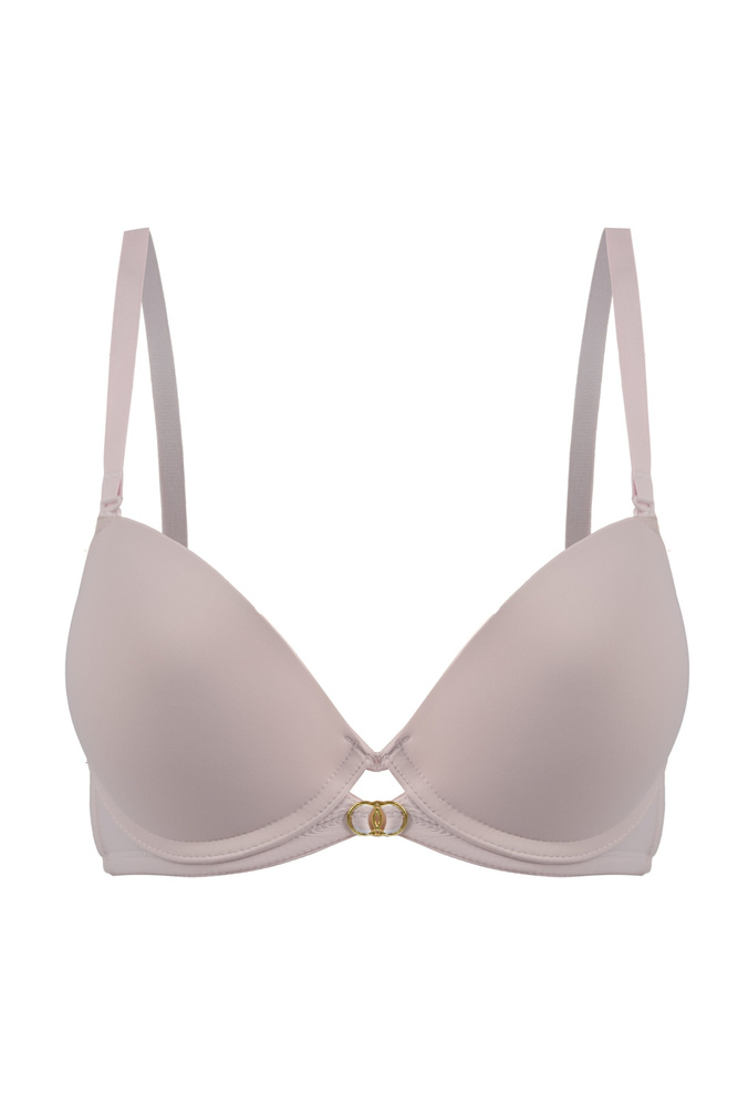 - Biustonosz Mediolano Nela 19241. Push-up w kolorze pudrowego różu, gładki, z regulowanymi ramiączkami i złotymi detalami.