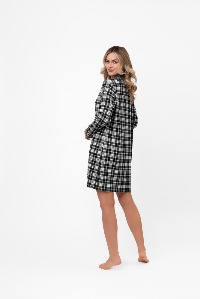 Model o prostej linii zapinany jest na guziki na całej długości przodu, co czyni go praktycznym i wygodnym w użytkowaniu. Klasyczny kołnierzyk z klapkami nadaje całości eleganckiego wyglądu, a długie rękawy sprawiają, że koszula idealnie sprawdza się na chłodniejsze wieczory.