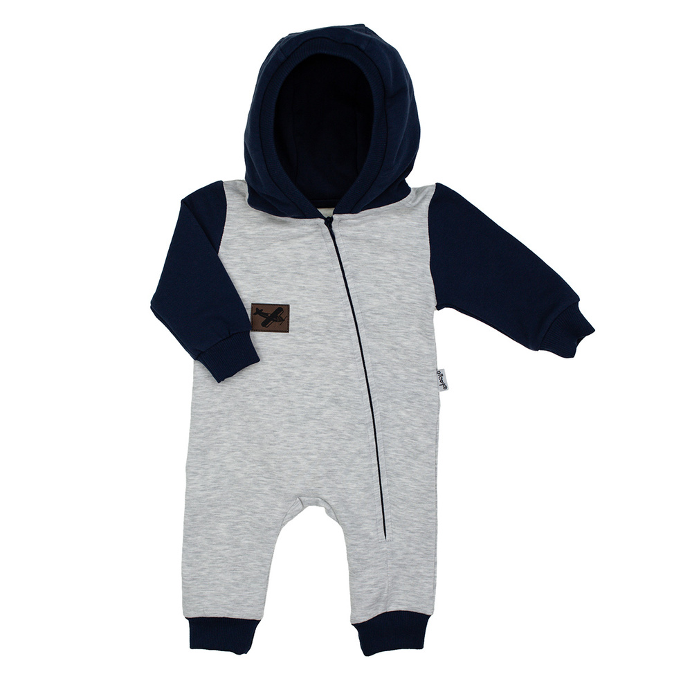 • Dwukolorowy pajac Nicol Willy – szary z granatowymi rękawami. Dresowa bawełna, kaptur, praktyczny suwak.