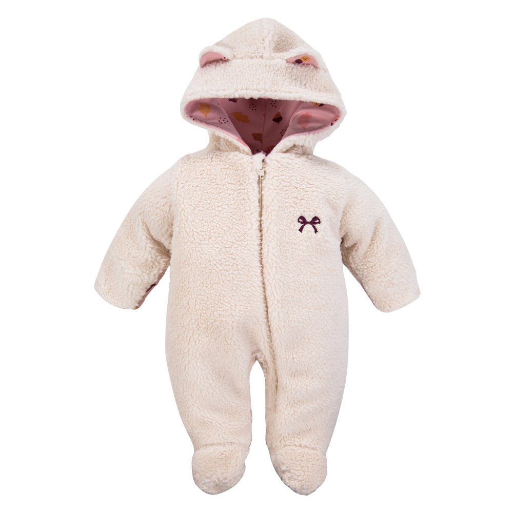 - Miękki kombinezon baranek w kolorze ecru. Zapinany na zamek, z kapturem ozdobionym uszkami. Idealny na spacery w chłodne dni.