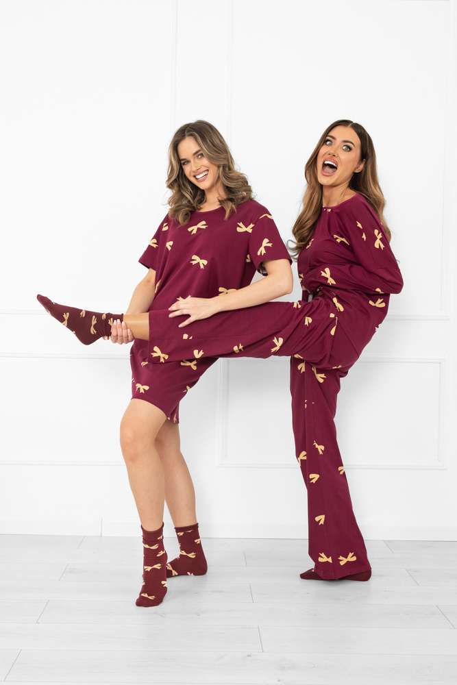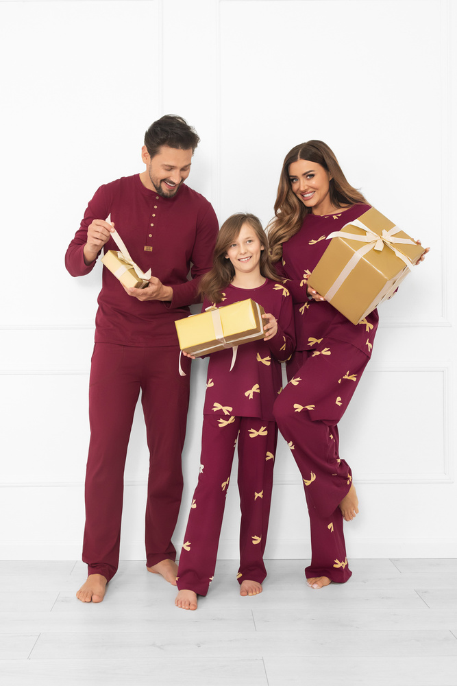Piżama damska Kwadro Italian Fashion to połączenie wygody, jakości i kobiecego stylu. Wykonana z naturalnej bawełny wolnej od pestycydów i sztucznych barwników, jest miękka, przyjemna w dotyku i bezpieczna dla skóry. Bluzka o luźnym kroju z długim rękawem i okrągłym dekoltem zapewnia swobodę ruchów, a spodnie z szerokimi nogawkami i elastyczną gumą w pasie gwarantują pełen komfort. Dodatkowym atutem są praktyczne kieszenie boczne. Całość zdobią subtelne kokardki, które dodają piżamie uroku i kobiecej elegancji. Idealny wybór dla mam i córek – dostępne są również piżamki dziecięce w tym samym stylu.