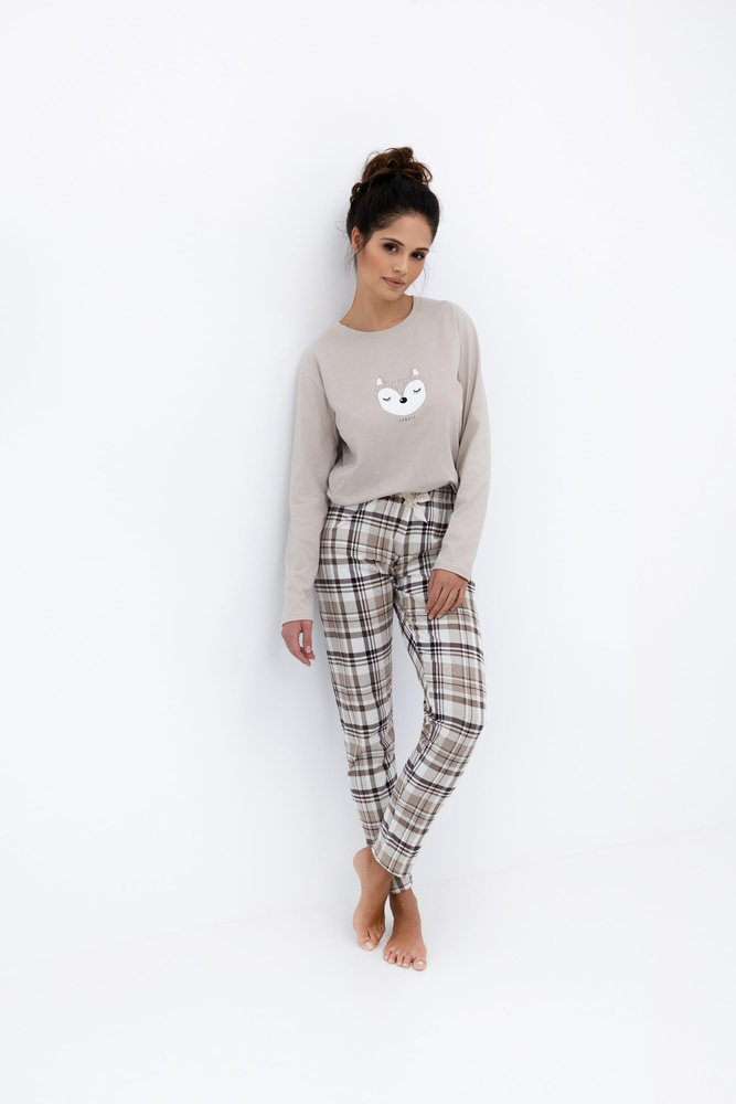 Górę stanowi koszulka z długim rękawem i okrągłym dekoltem, ozdobiona kolorowym nadrukiem z przodu, który dodaje całości dziewczęcego uroku. Do kompletu dołączono długie spodnie w kratkę z elastyczną gumką w pasie i ozdobną satynową kokardką, co zapewnia wygodę i estetyczny wygląd.