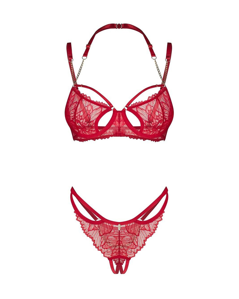• Zmysłowy komplet Obsessive Matildea: biustonosz z fiszbinami i otwartymi stringami. Koronkowe wykończenie, zapięcie na plecach.