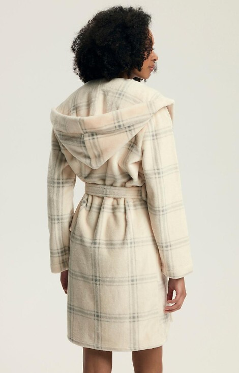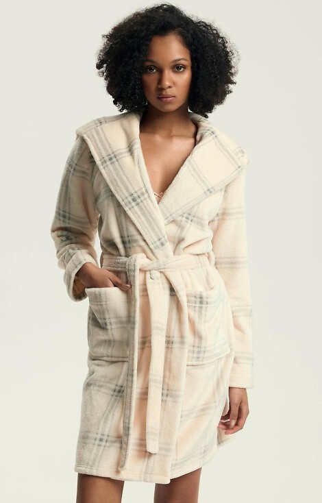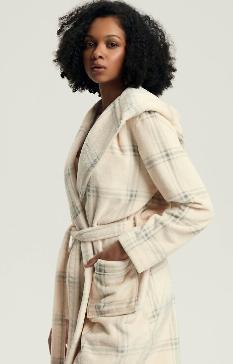 • Szlafrok damski z miękkiej dzianiny, z kapturem i kieszeniami. Wzór w kratkę dodaje mu uroku.