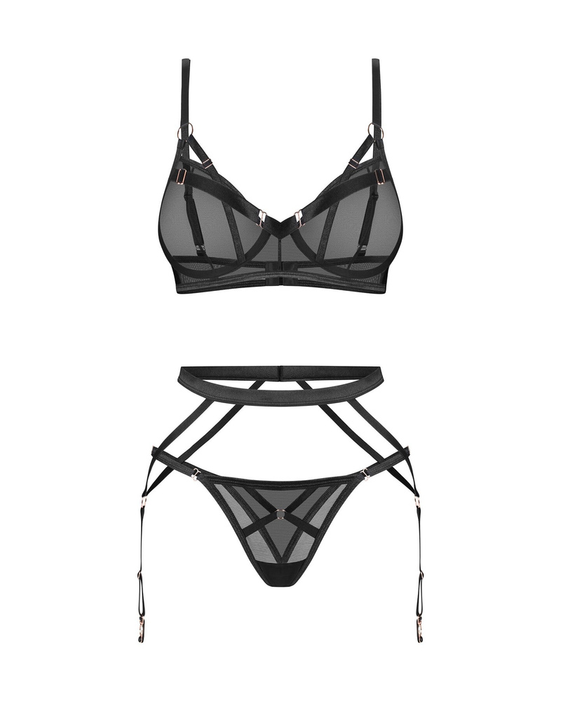 Komplet Euridia 3-częściowy Obsessive czarny– biustonosz, stringi i pas do pończoch